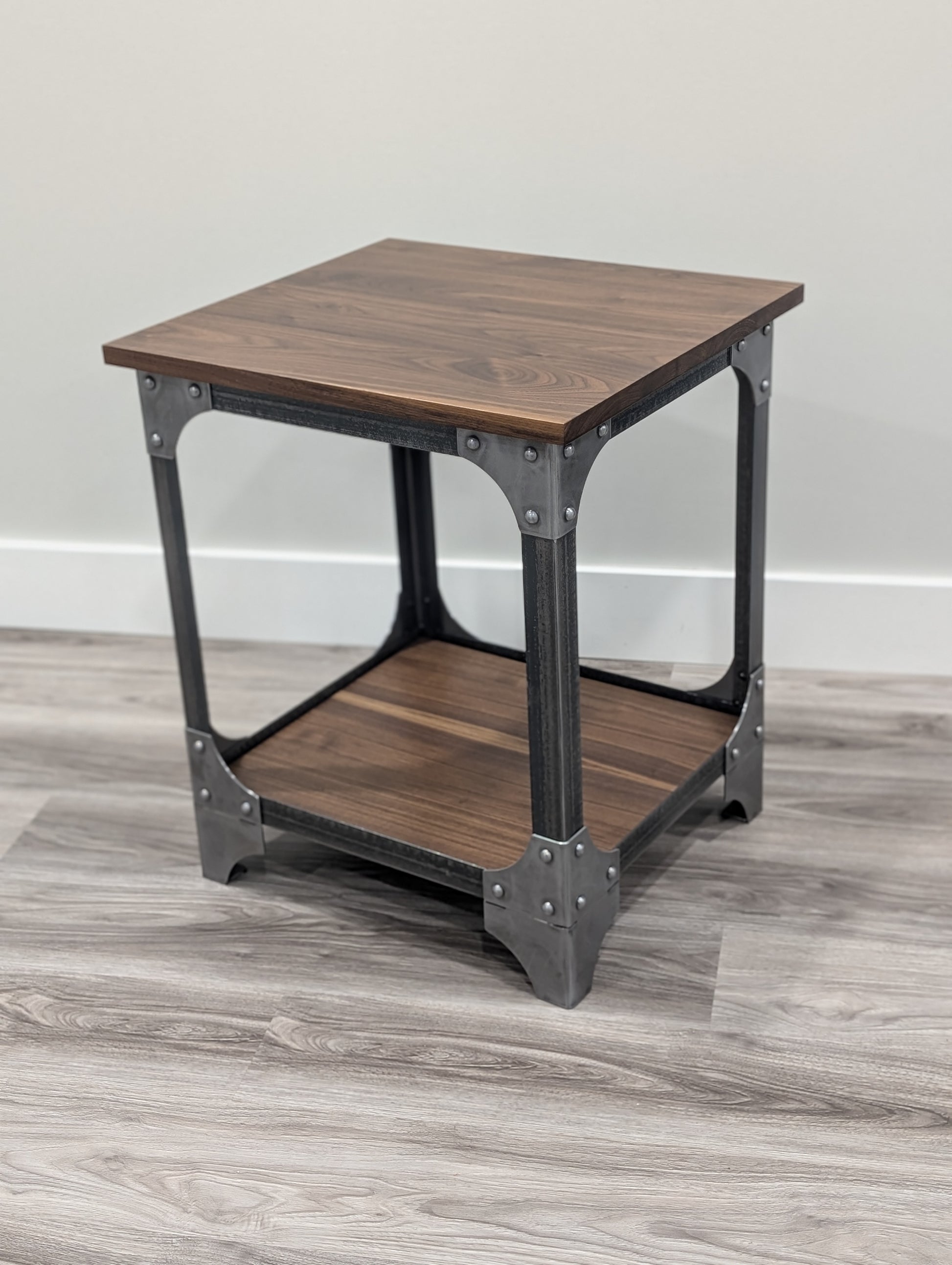 This end table is carefully constructed using a blend of high-quality materials. It features a top and bottom shelf made of walnut, as well as a sturdy steel frame with riveted gussets.